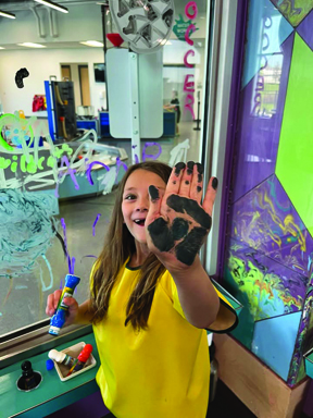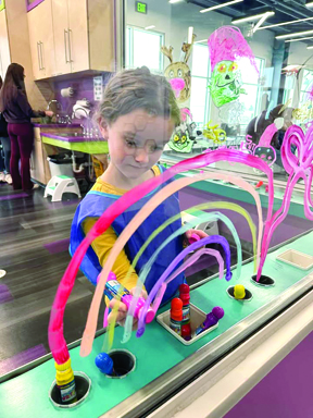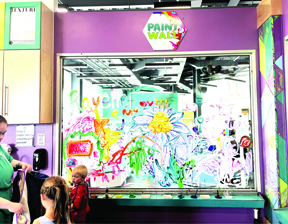 The Paint Wall: One of the most eye-catching features of the studio, the Paint Wall invites kids to paint on a large vertical glass surface. Using paint dobbers and washable paints, children create bold, expressive artwork. Working vertically helps build muscle strength, coordination, and spatial awareness, while also allowing kids to see their art from a whole new perspective.