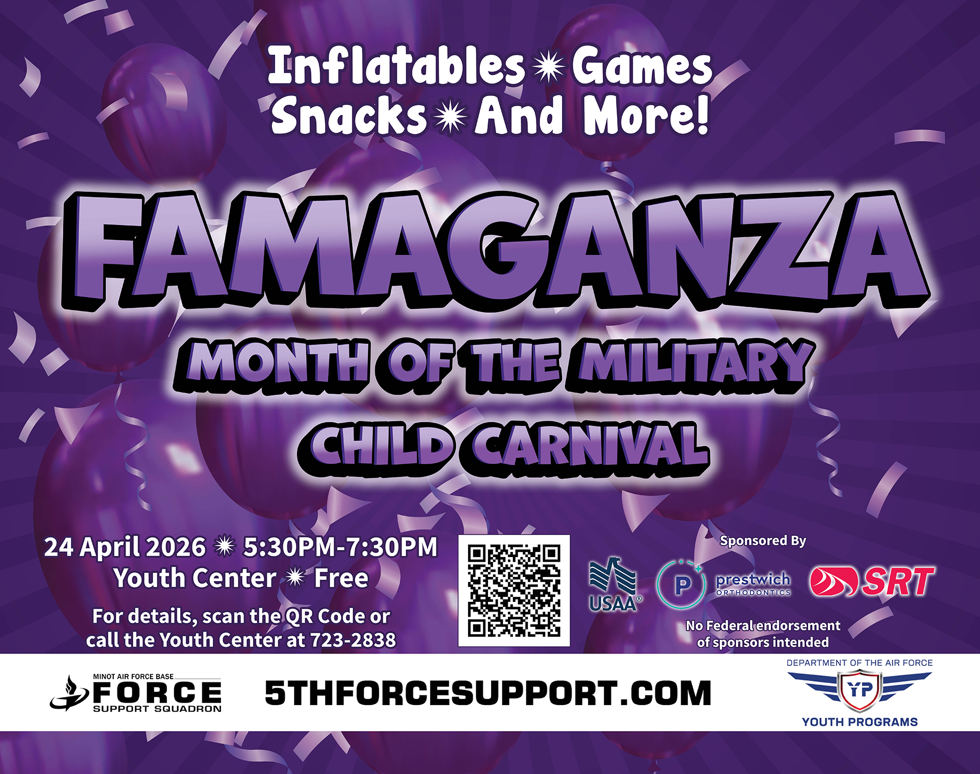 Inflatables, games, airbrush, snacks, and more during FAMAGANZA – Month of the Military Child Carnival on 24 April 2026 from 5:30PM – 7:30PM at the Youth Center!