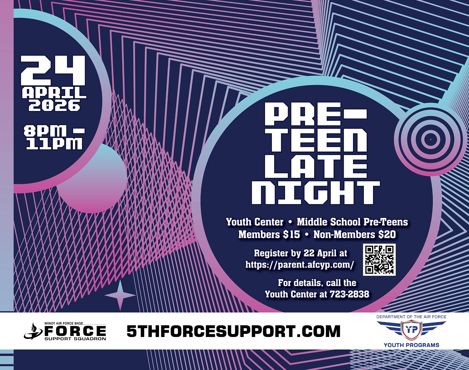 Stay up late, hang out with friends, and enjoy a night packed with exciting activities, food, cool games, and tons of laughter during Pre-Teen Late Night on 24 April 2026 from 8:00PM – 11:00PM at the Youth Center!