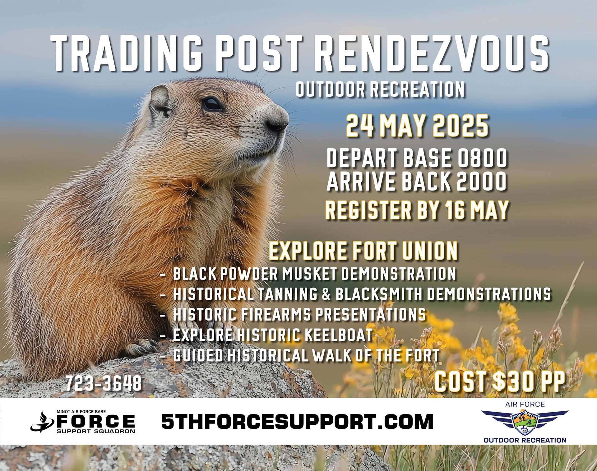 Join Outdoor rec for a trip to Williston at Fort Union Trading post 24 May 2025. Depart Base 0800 & Arrive back 2000. Cost is only $30 Per person and you can register now until 16 May.